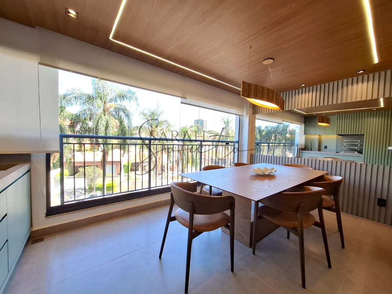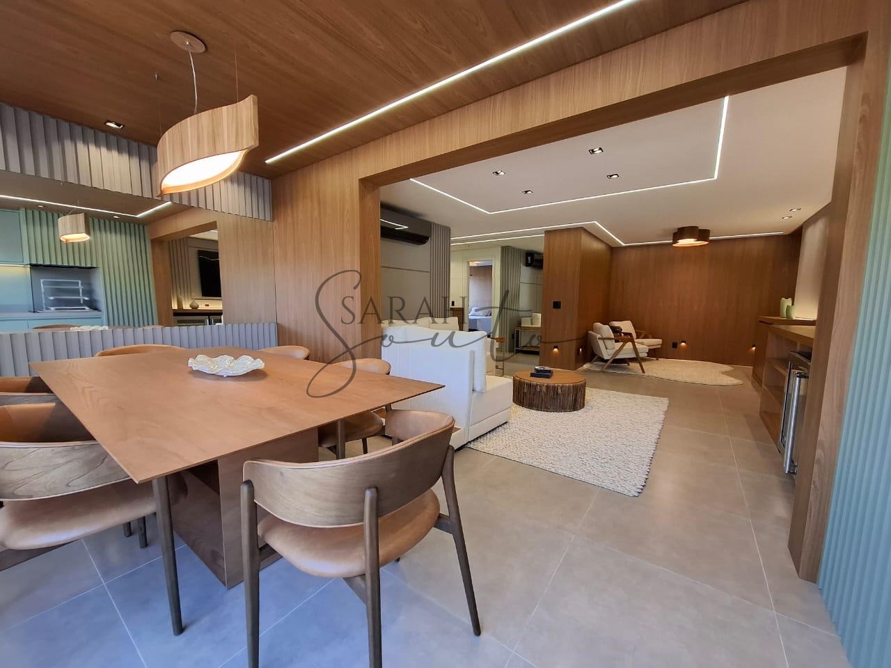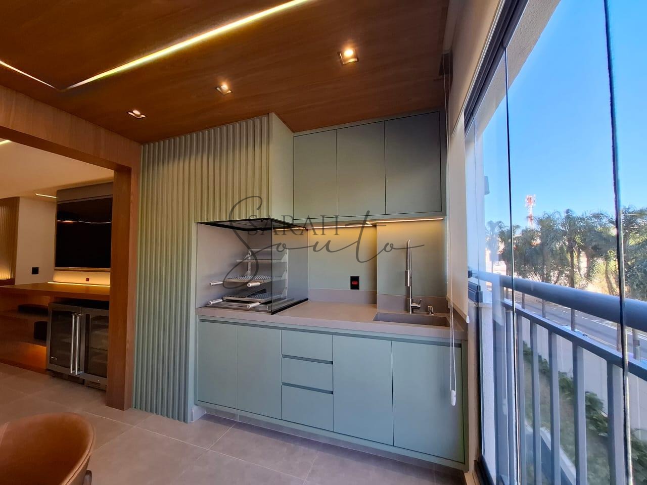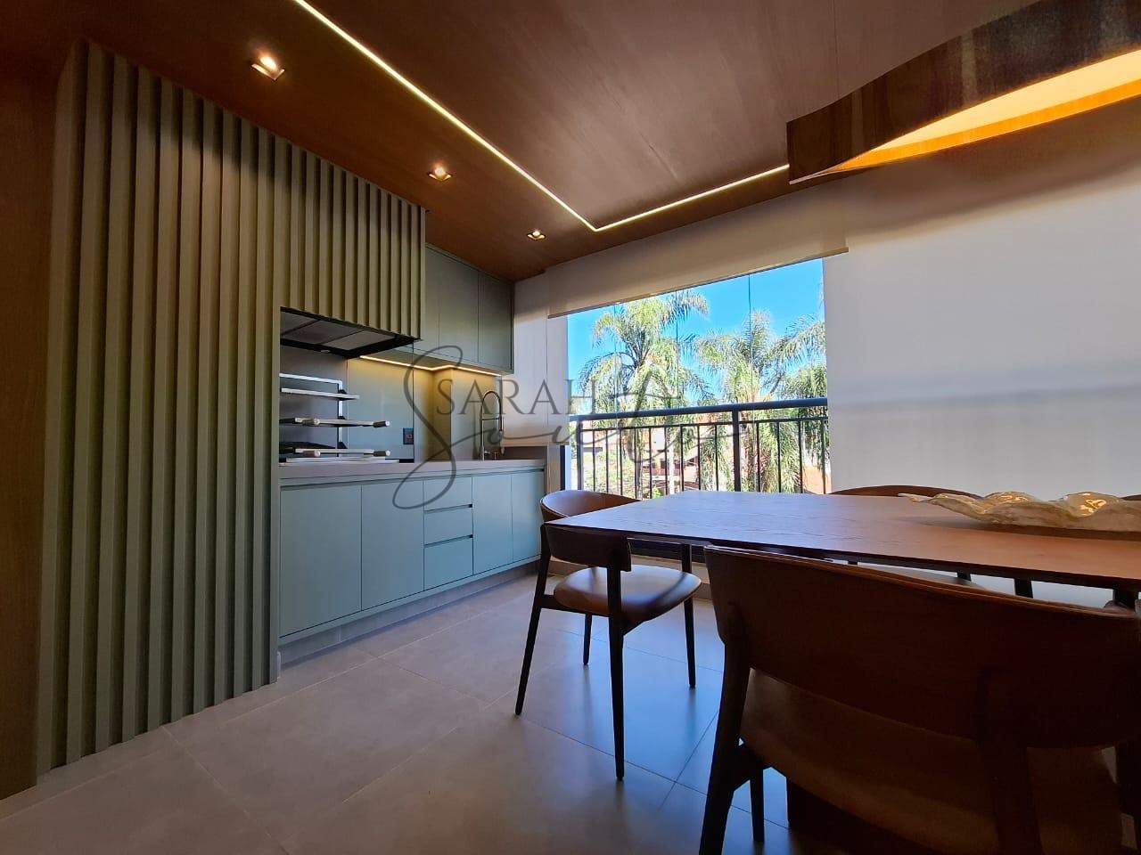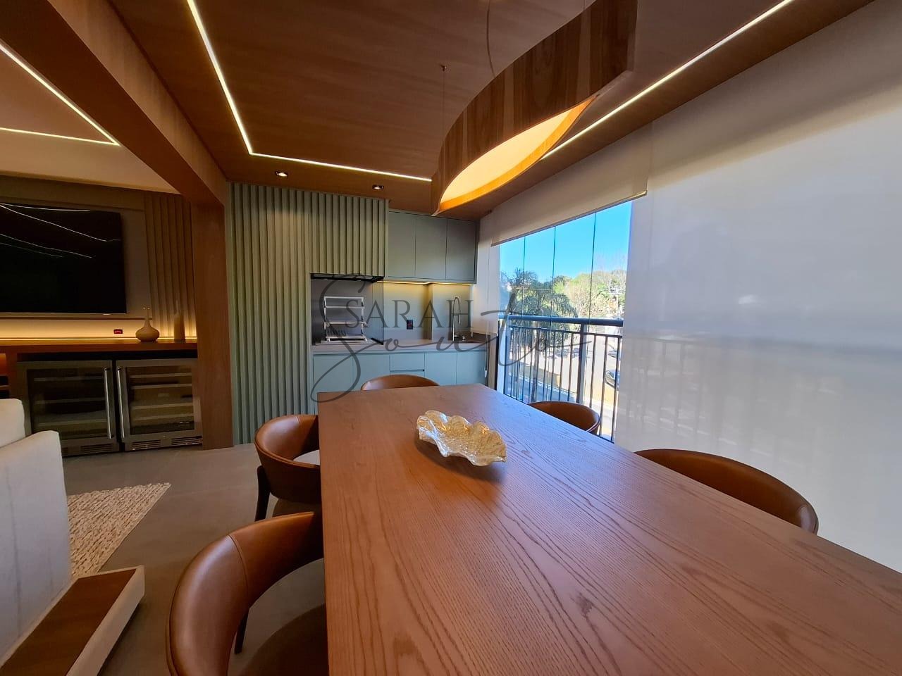 O apartamento conta com marcenaria planejada em todos os ambientes, porcelanato de primeira linha e detalhes ripados que trazem requinte. A varanda gourmet, fechada com vidros, é equipada com churrasqueira, cortinas e persianas sob medida, criando um espaço perfeito para receber amigos e familiares.