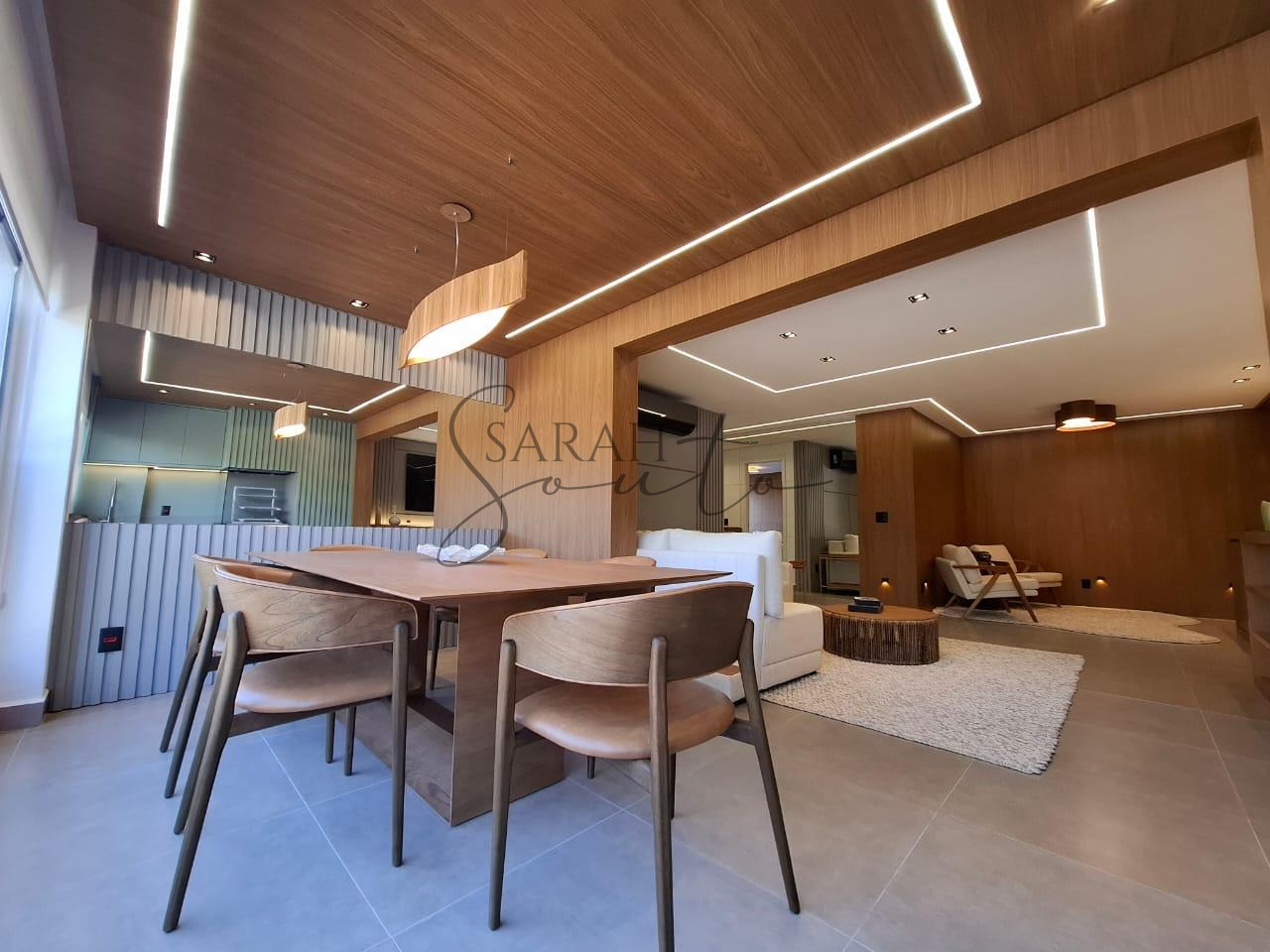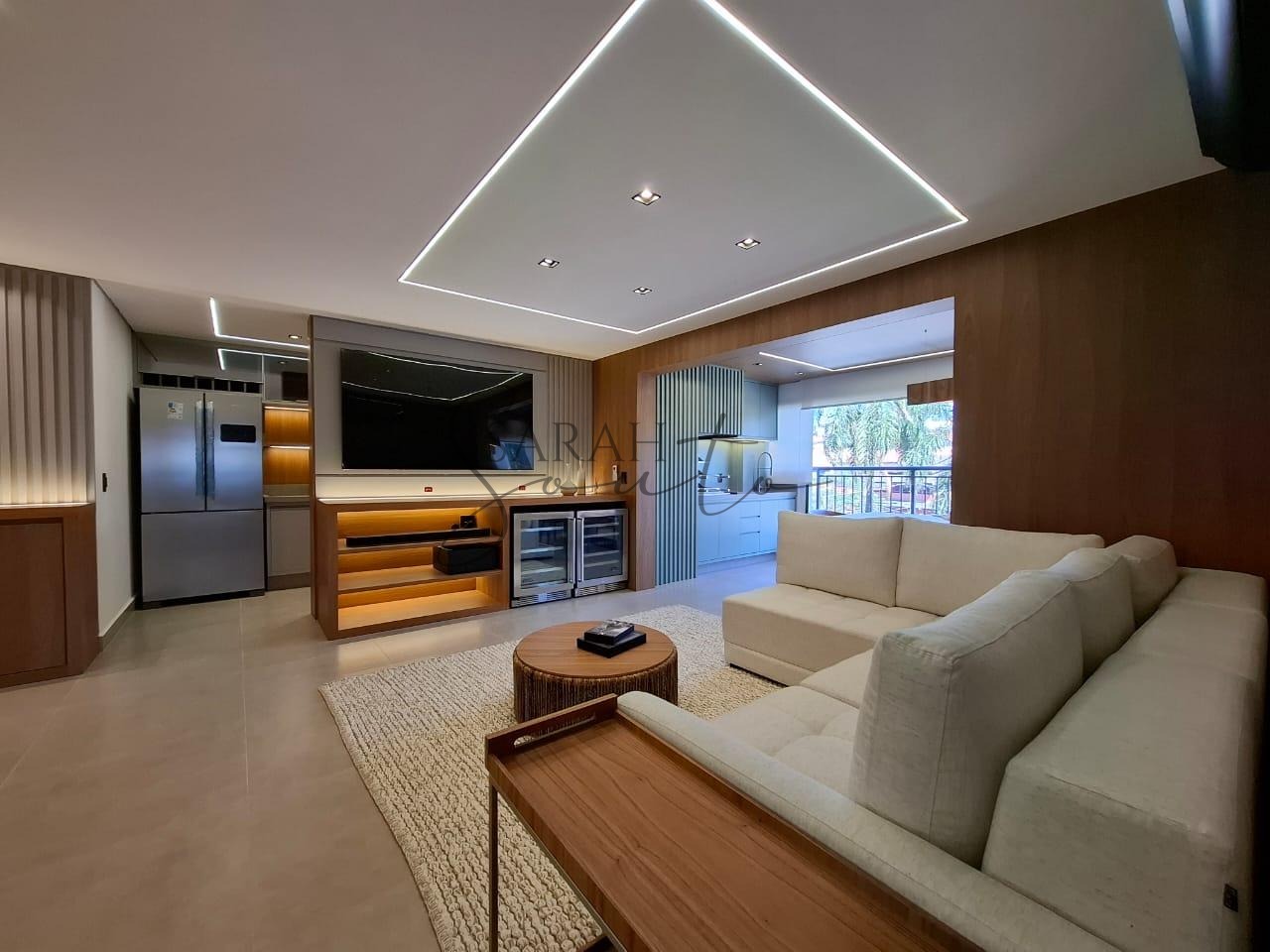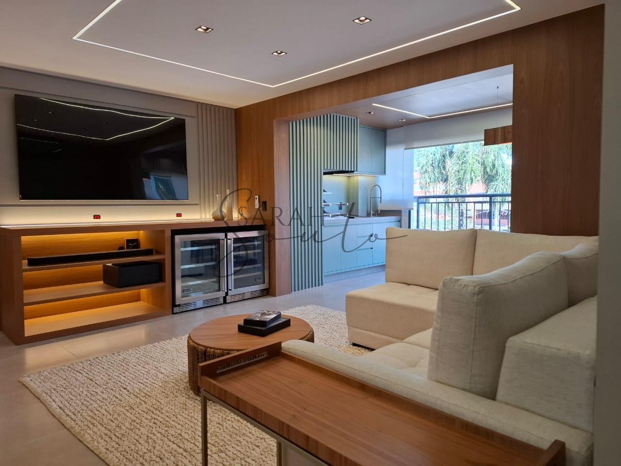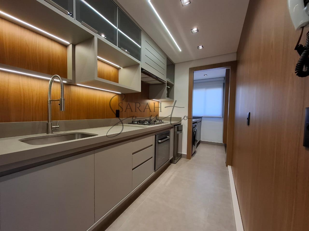 O apartamento conta com marcenaria planejada em todos os ambientes, porcelanato de primeira linha e detalhes ripados que trazem requinte. A varanda gourmet, fechada com vidros, é equipada com churrasqueira, cortinas e persianas sob medida, criando um espaço perfeito para receber amigos e familiares.