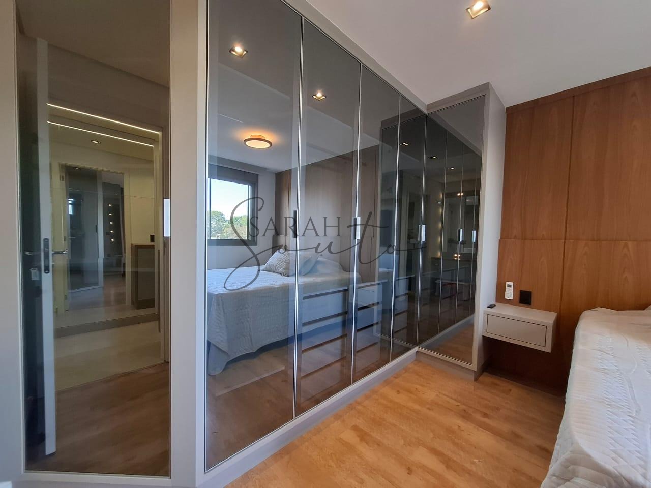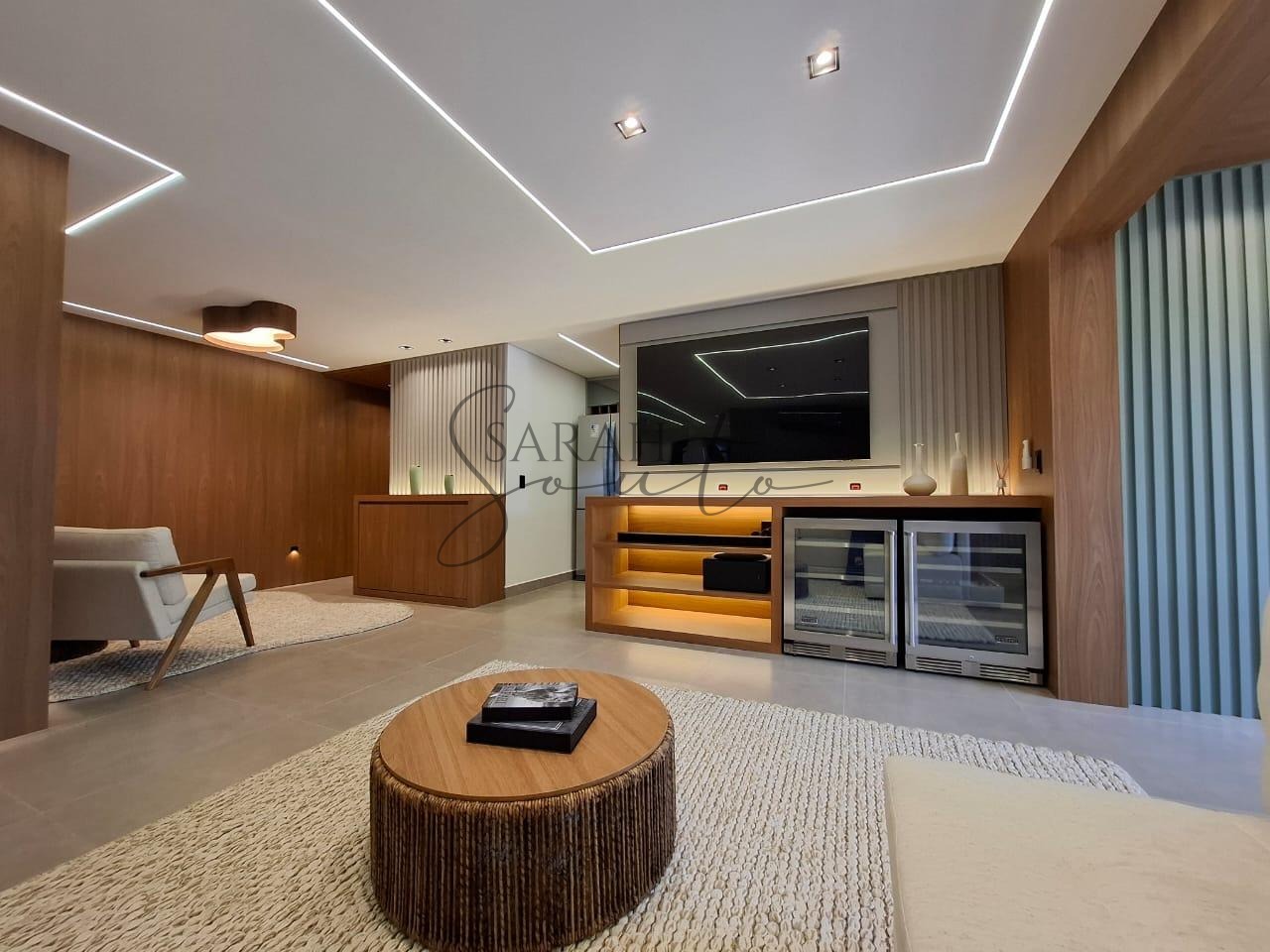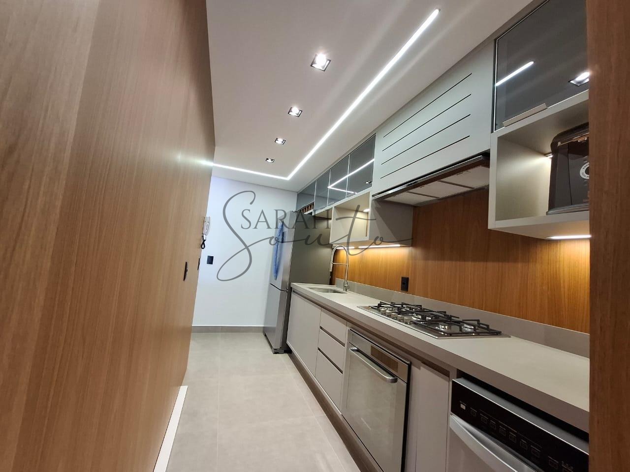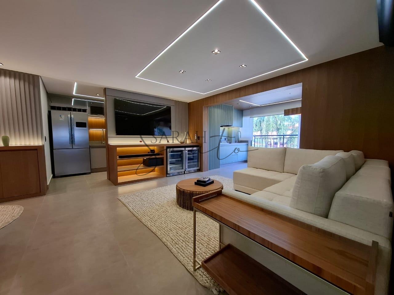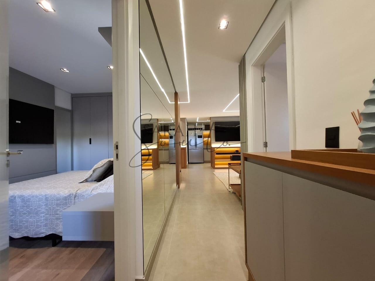 O apartamento conta com marcenaria planejada em todos os ambientes, porcelanato de primeira linha e detalhes ripados que trazem requinte. A varanda gourmet, fechada com vidros, é equipada com churrasqueira, cortinas e persianas sob medida, criando um espaço perfeito para receber amigos e familiares.