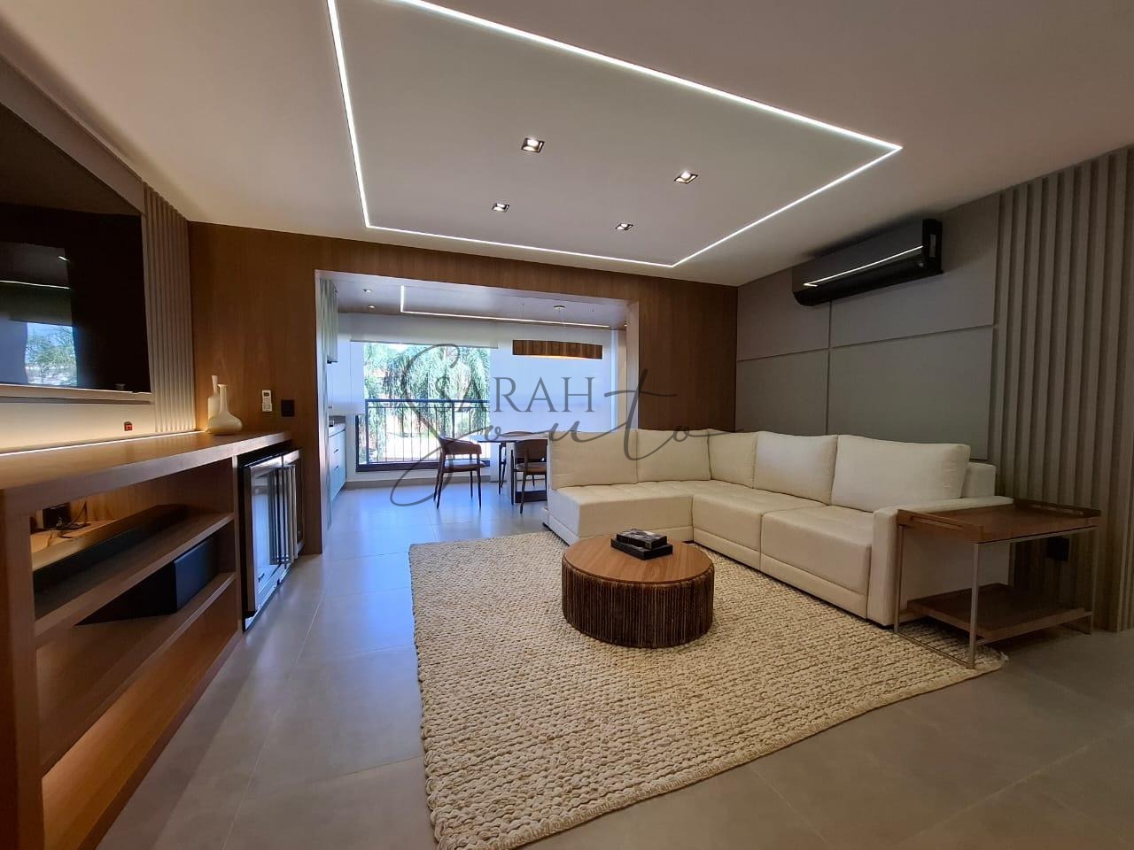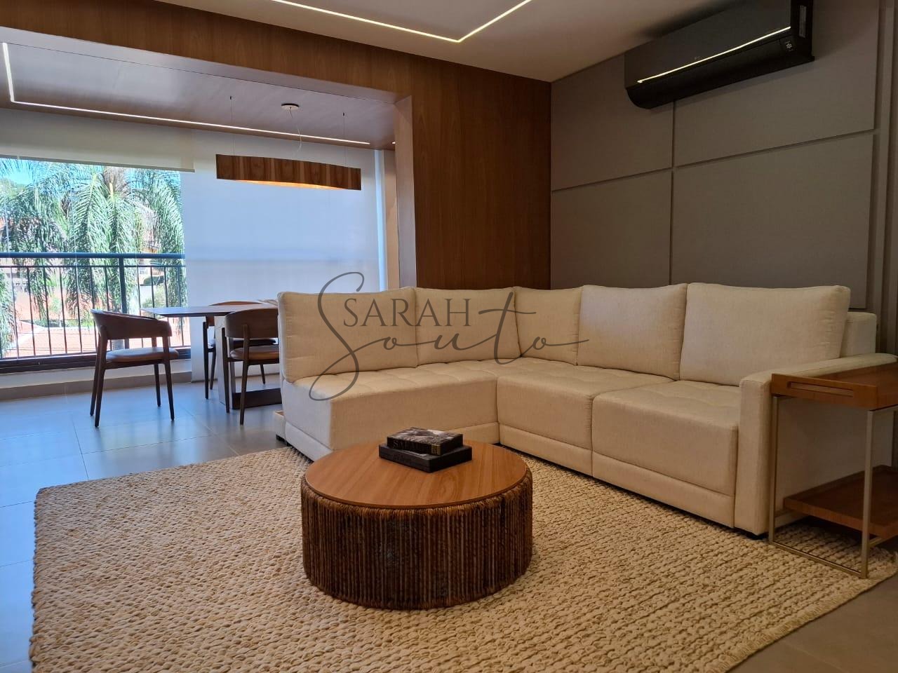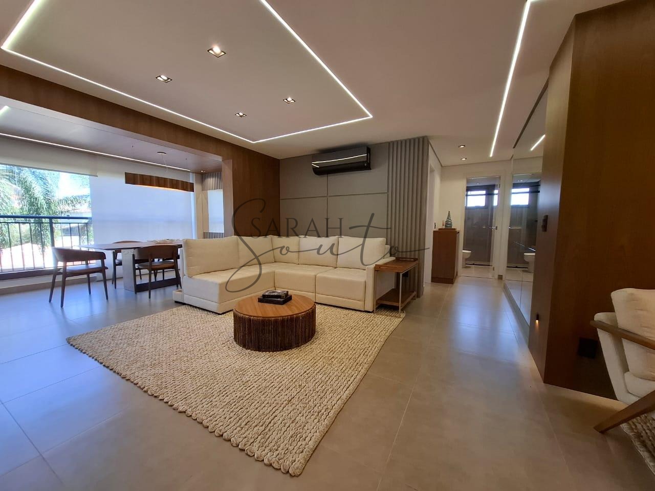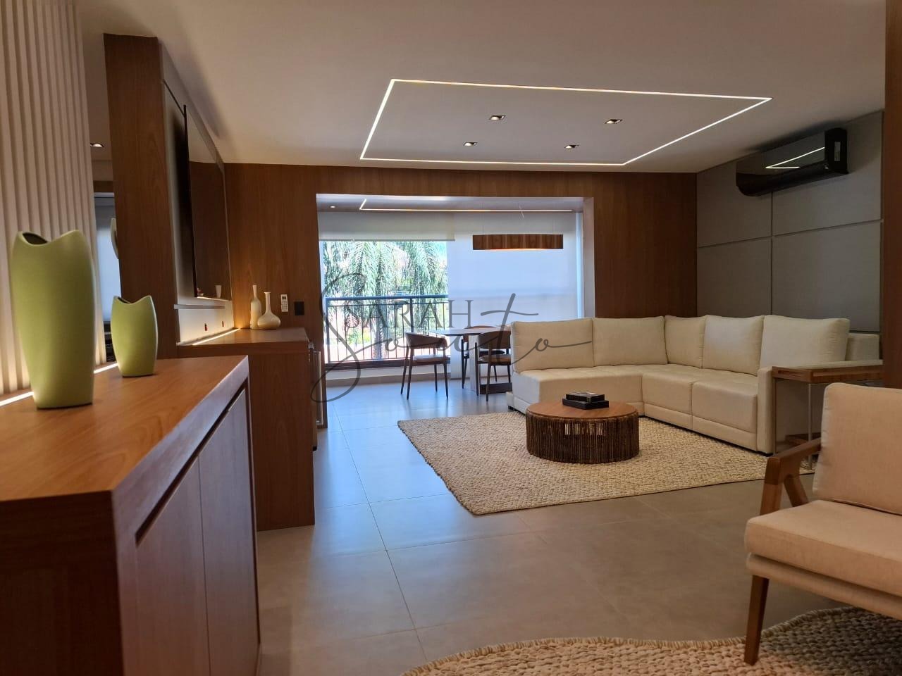 O apartamento conta com marcenaria planejada em todos os ambientes, porcelanato de primeira linha e detalhes ripados que trazem requinte. A varanda gourmet, fechada com vidros, é equipada com churrasqueira, cortinas e persianas sob medida, criando um espaço perfeito para receber amigos e familiares.