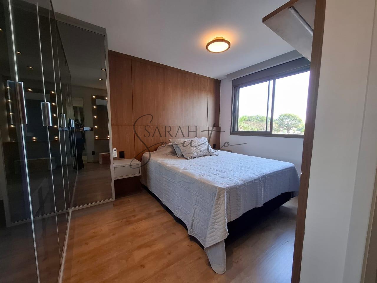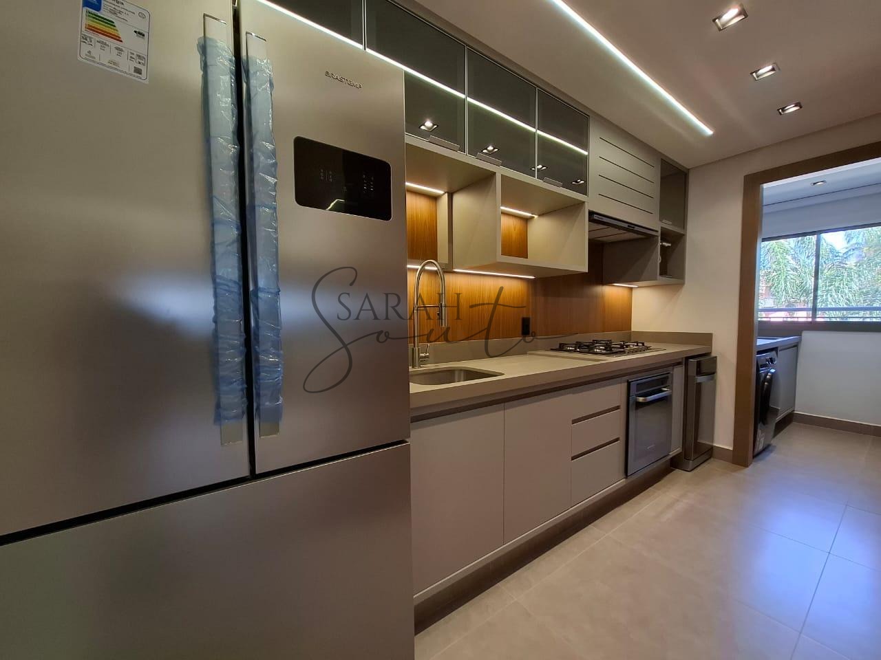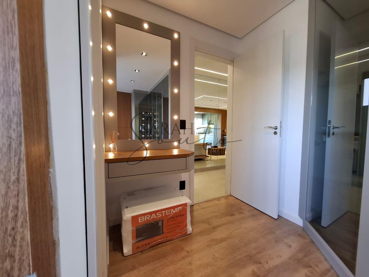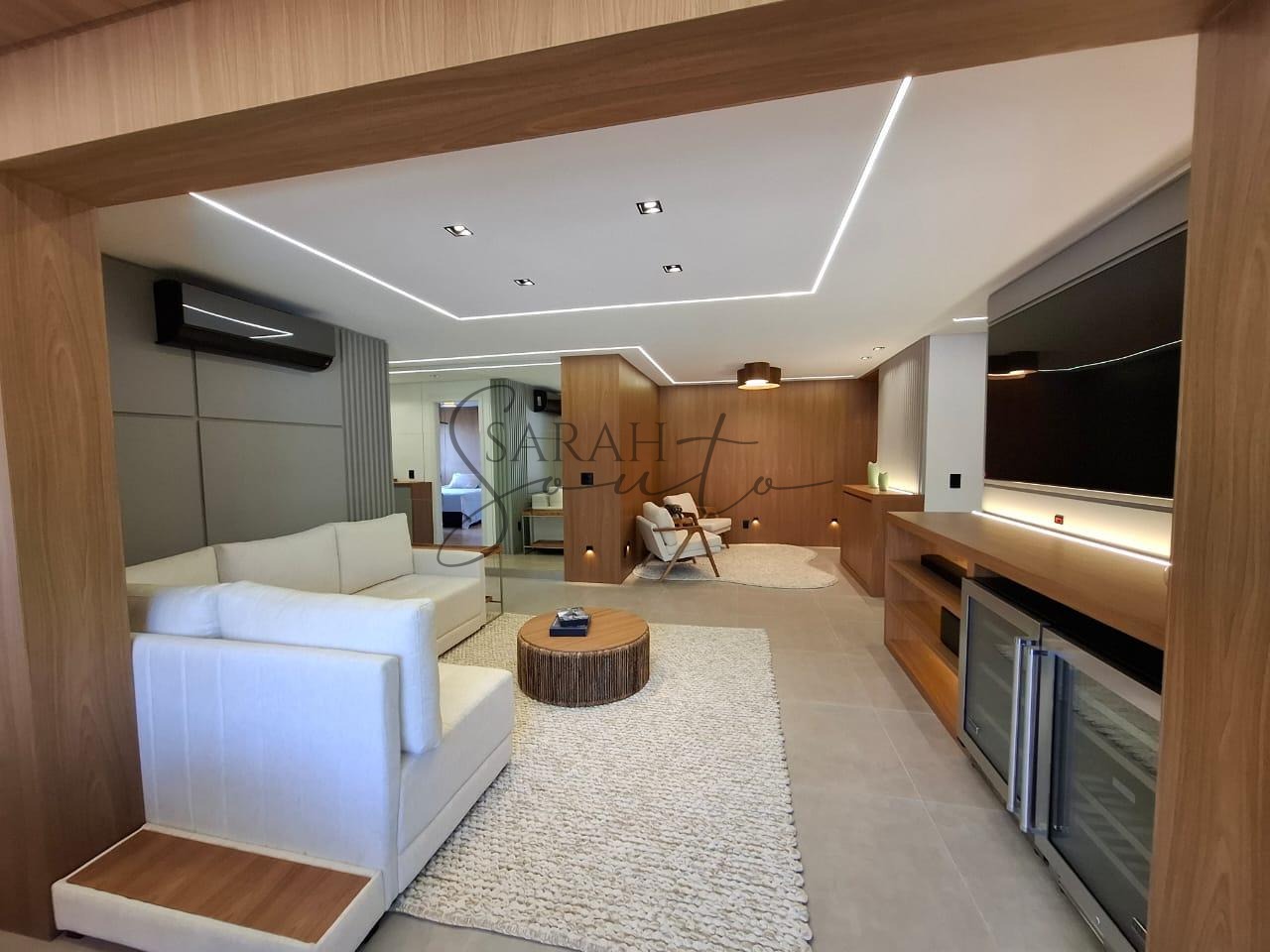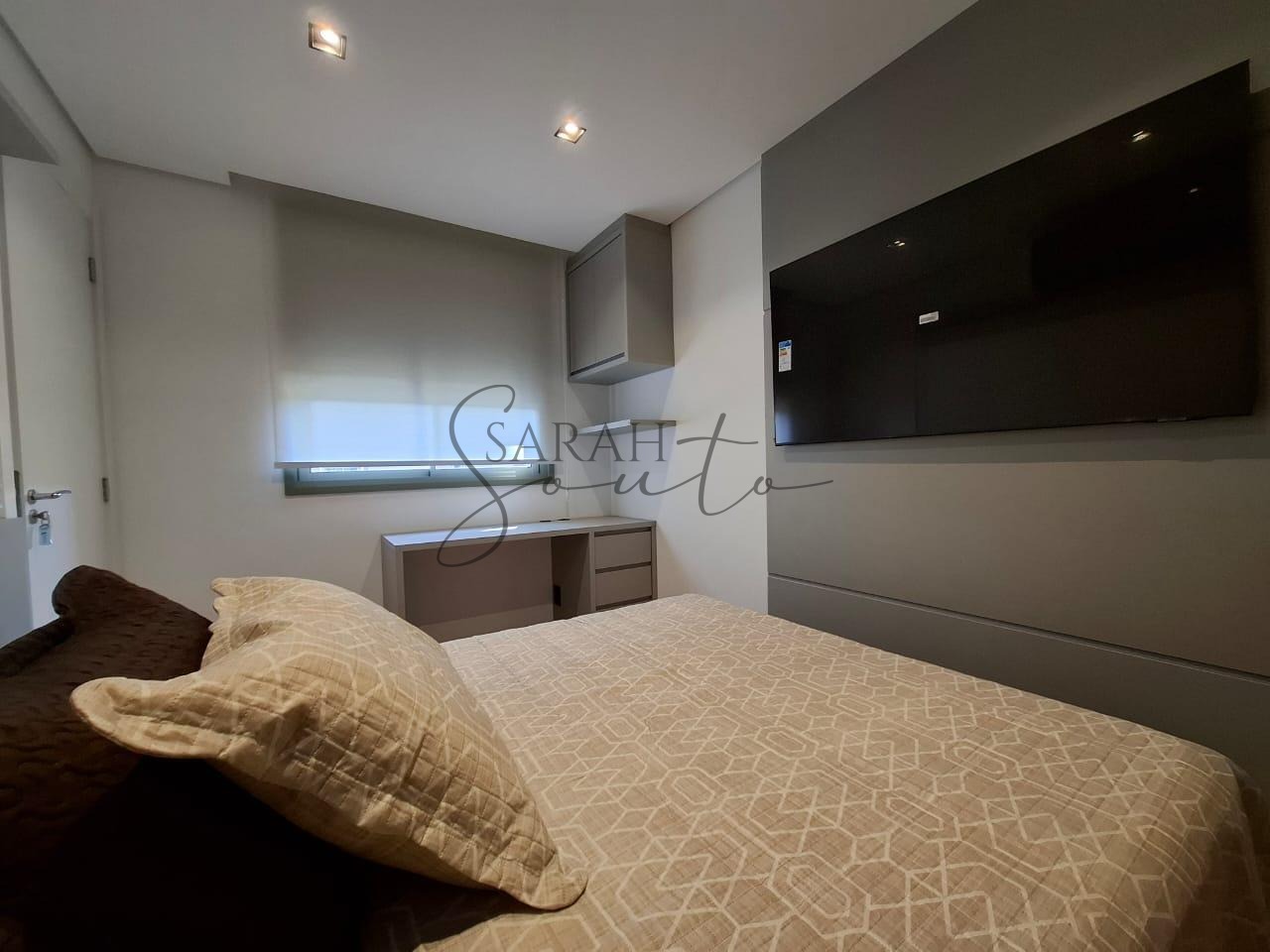 O apartamento conta com marcenaria planejada em todos os ambientes, porcelanato de primeira linha e detalhes ripados que trazem requinte. A varanda gourmet, fechada com vidros, é equipada com churrasqueira, cortinas e persianas sob medida, criando um espaço perfeito para receber amigos e familiares.