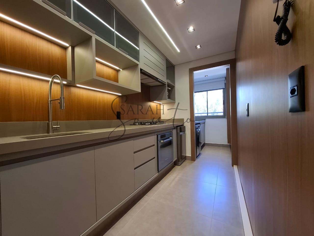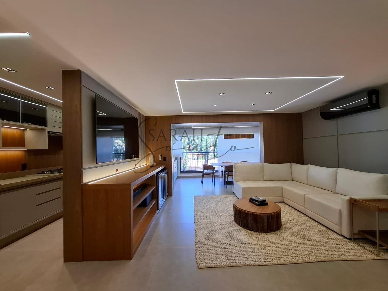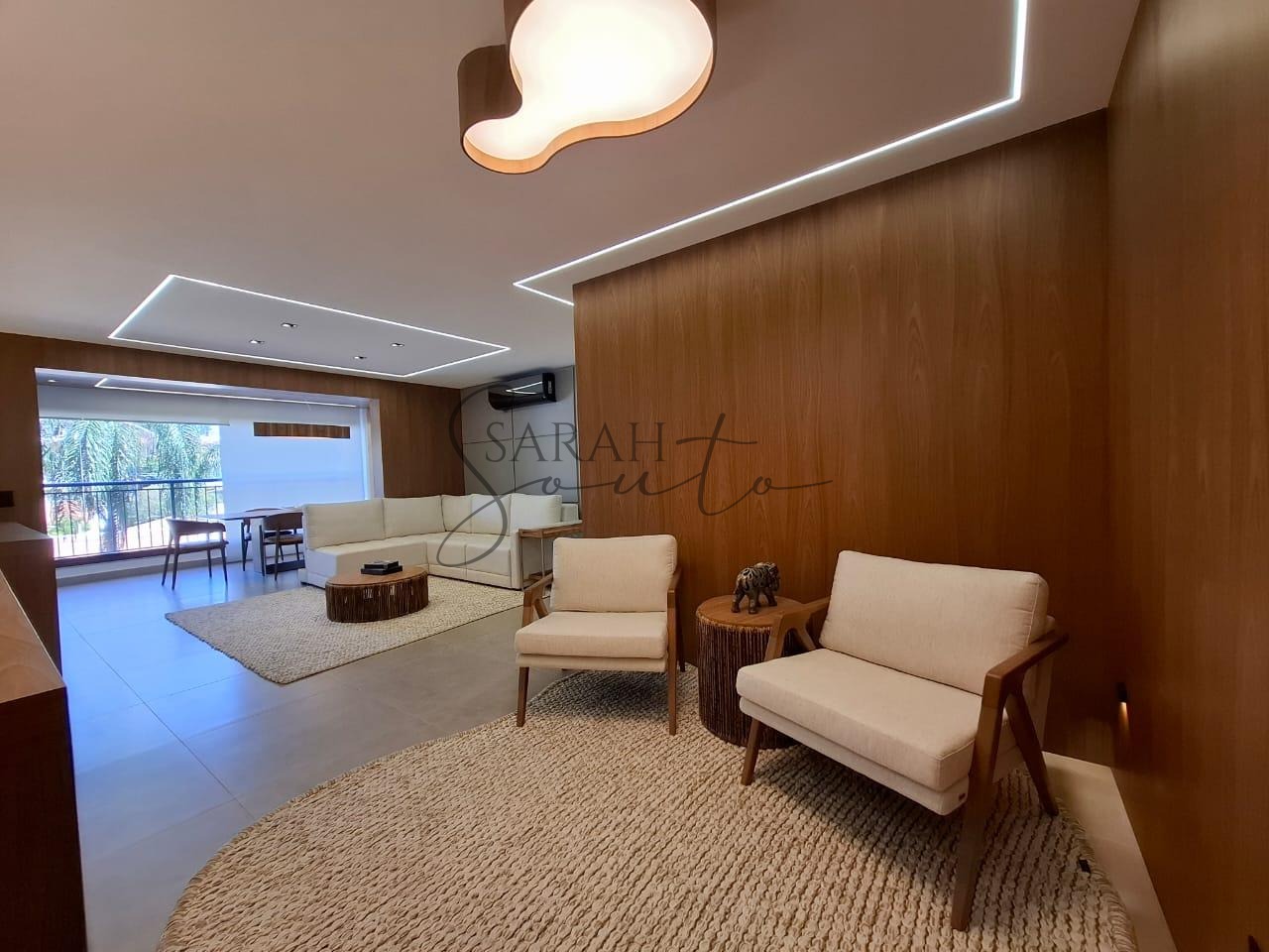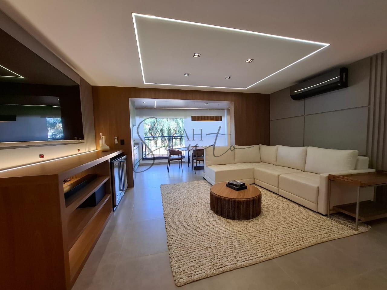 O apartamento conta com marcenaria planejada em todos os ambientes, porcelanato de primeira linha e detalhes ripados que trazem requinte. A varanda gourmet, fechada com vidros, é equipada com churrasqueira, cortinas e persianas sob medida, criando um espaço perfeito para receber amigos e familiares.