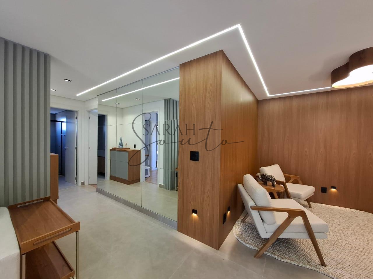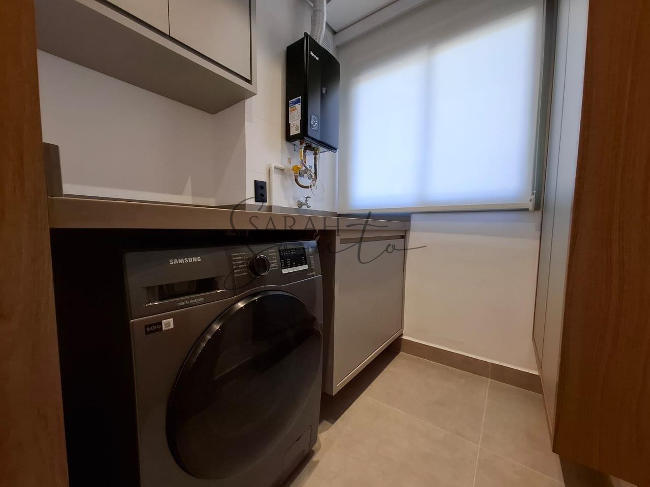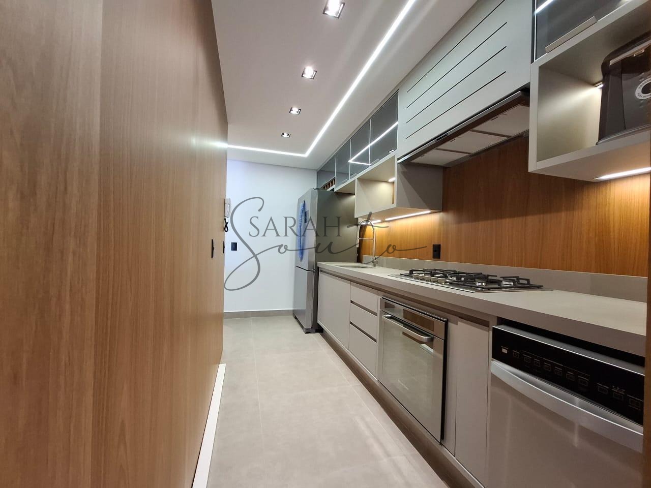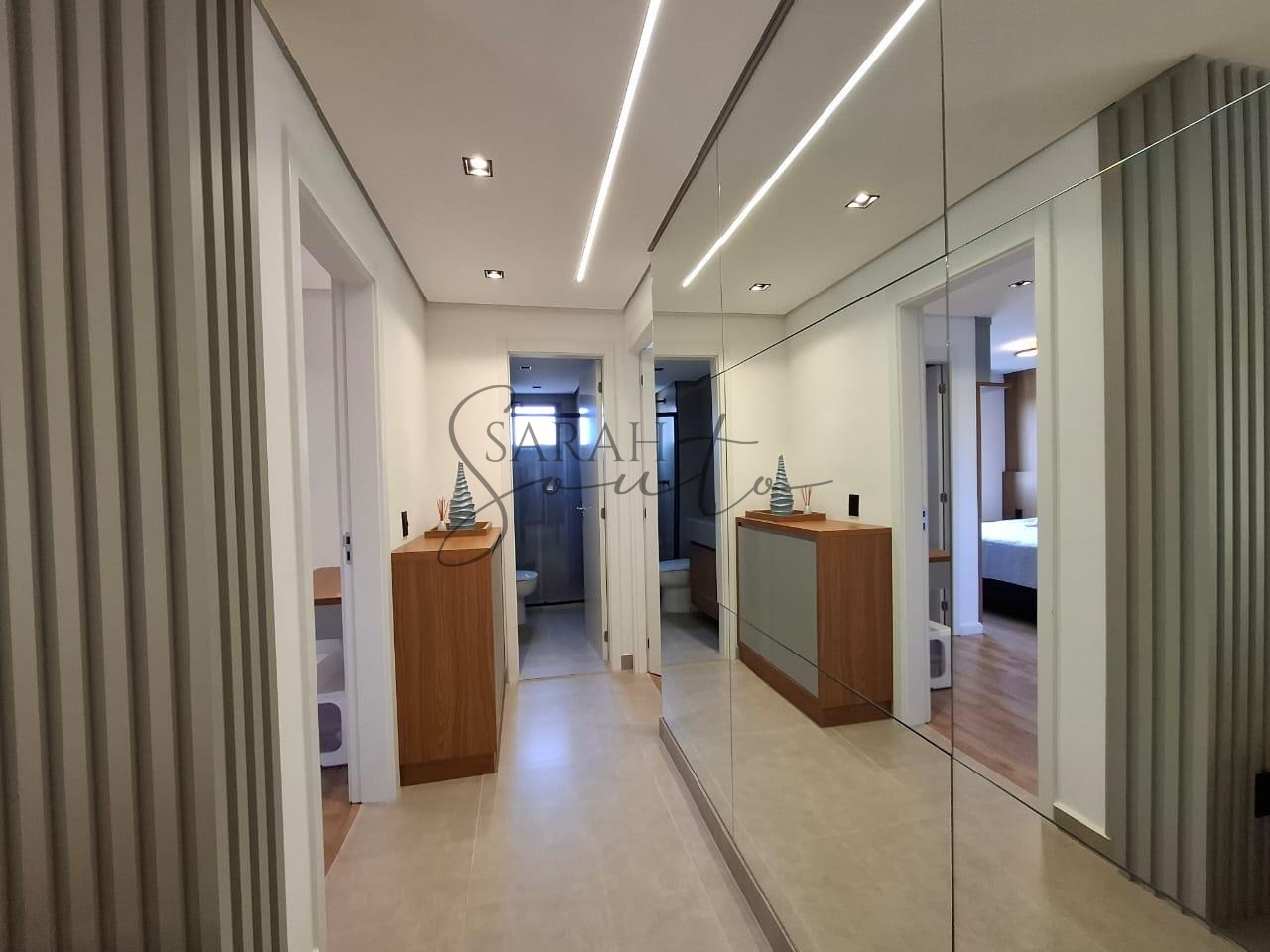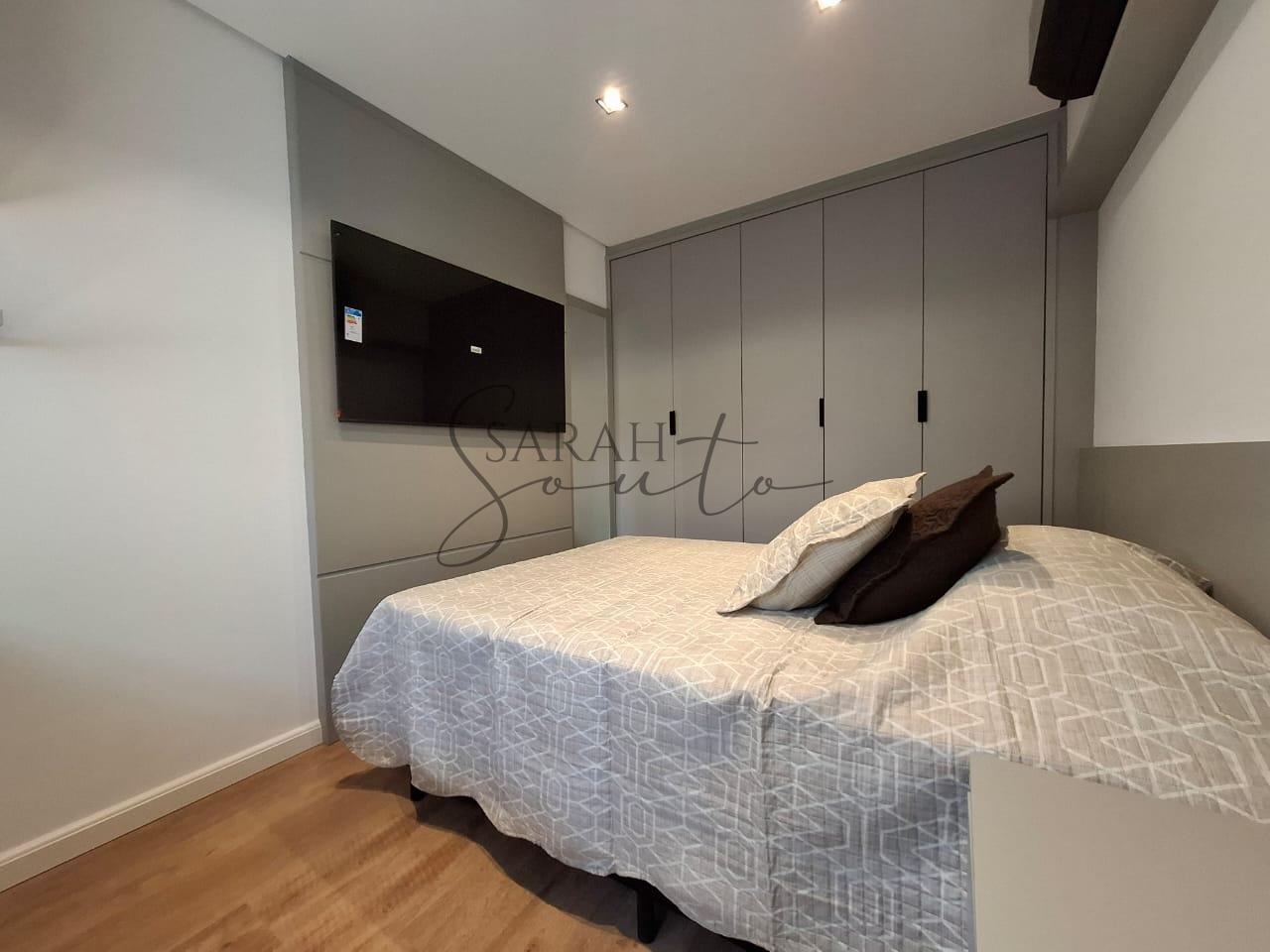 O apartamento conta com marcenaria planejada em todos os ambientes, porcelanato de primeira linha e detalhes ripados que trazem requinte. A varanda gourmet, fechada com vidros, é equipada com churrasqueira, cortinas e persianas sob medida, criando um espaço perfeito para receber amigos e familiares.