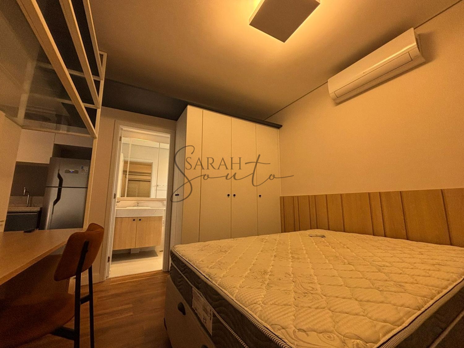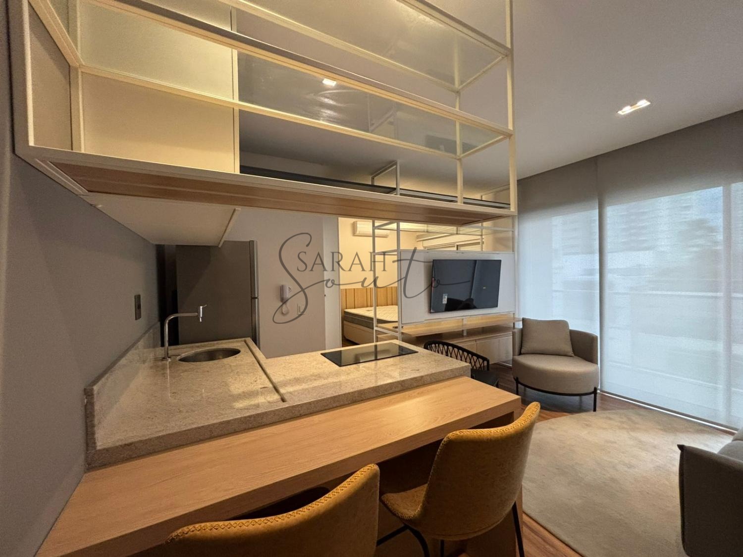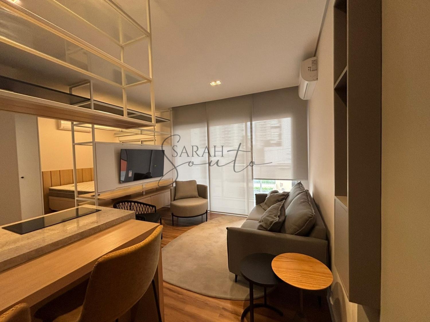 Apartamento mobiliado com 1 quarto, 1 banheiro, sala para dois ambientes com sacada, cozinha planejada e 1 vaga de garagem.