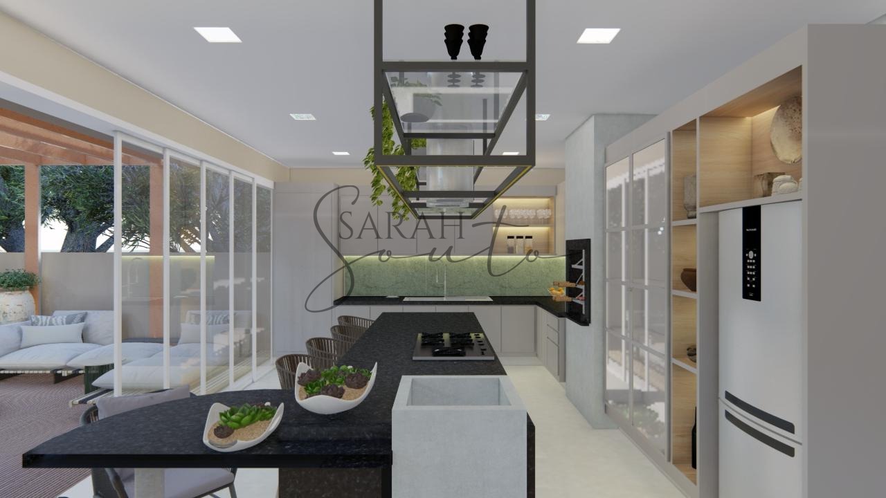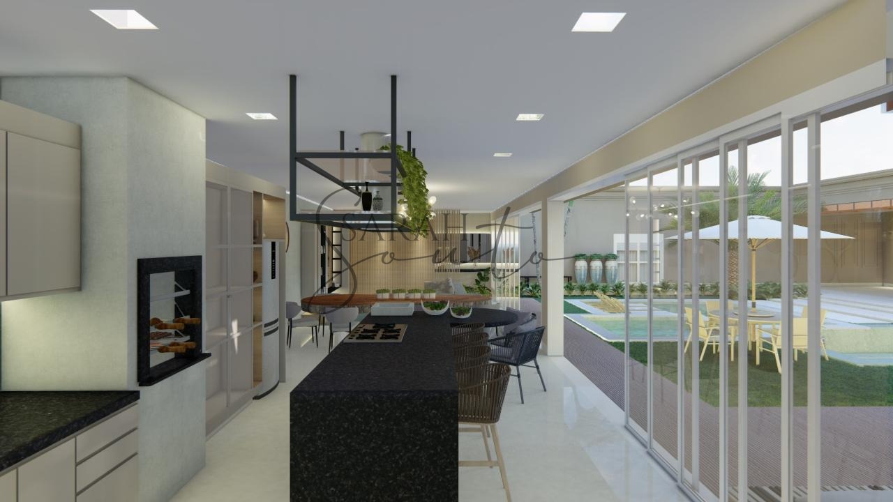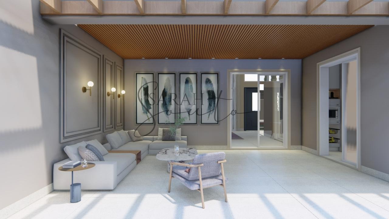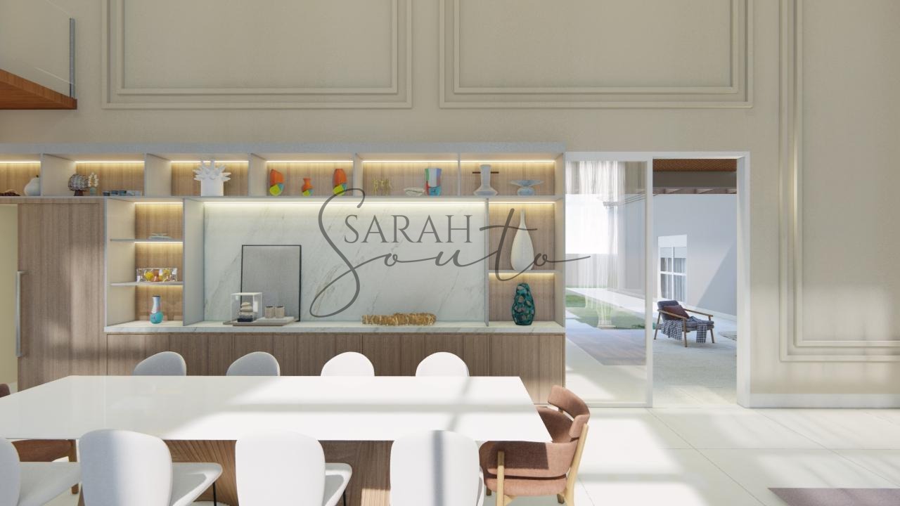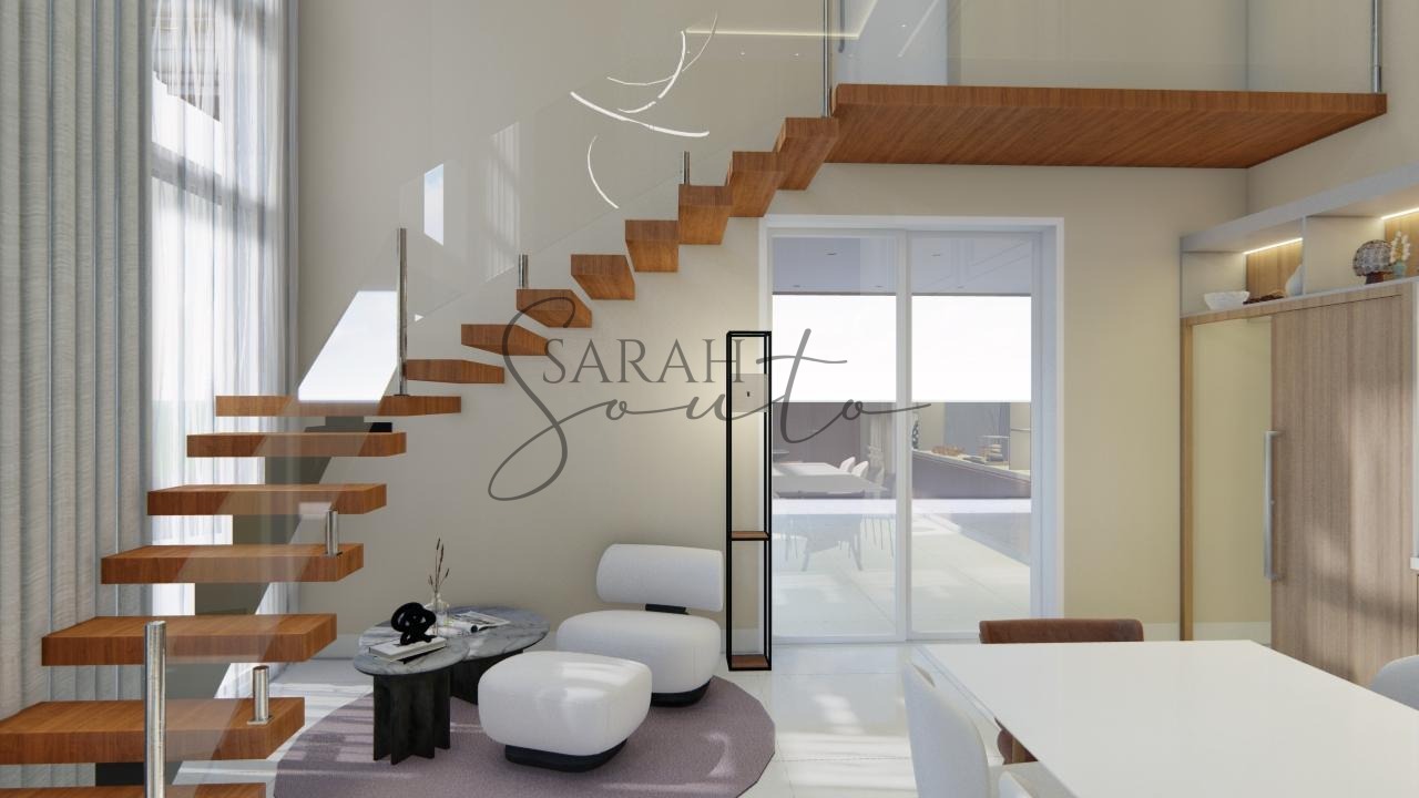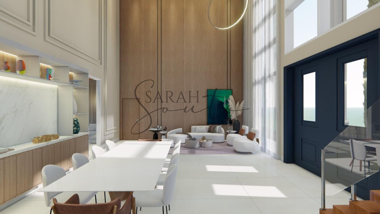 Logo na entrada, a amplitude dos espaços é ressaltada pelo pé-direito duplo da sala de estar, que se abre para o cenário natural à frente. O projeto contempla uma suíte master com closet, além de dois dormitórios também com closet, garantindo privacidade e praticidade. Ambientes como a sala de televisão, o mezanino e a cozinha planejada, acompanhada de despensa e área de serviço com armários sob medida, traduzem a funcionalidade aliada ao requinte.