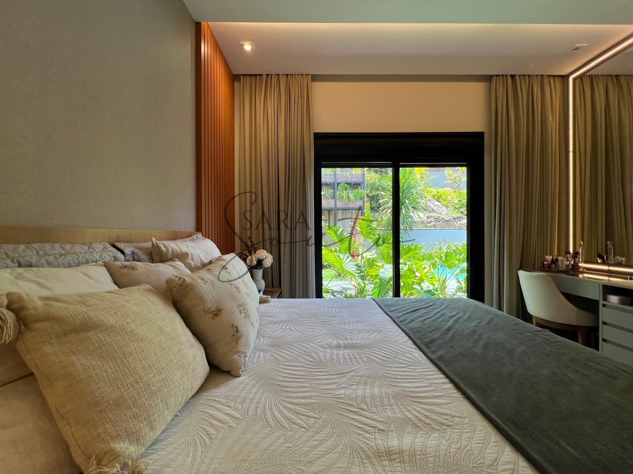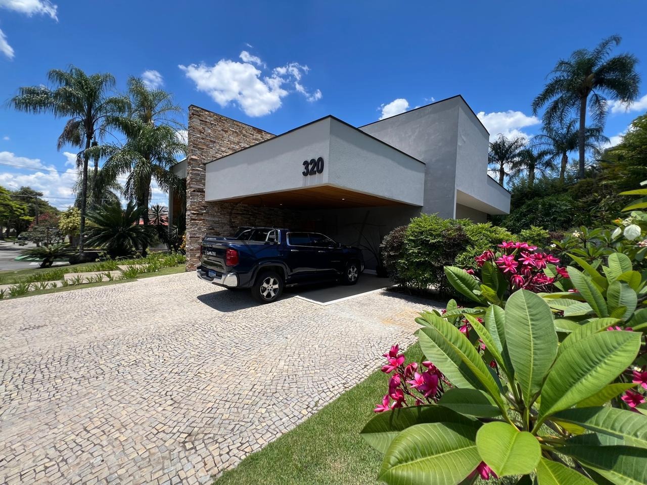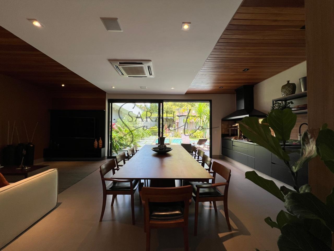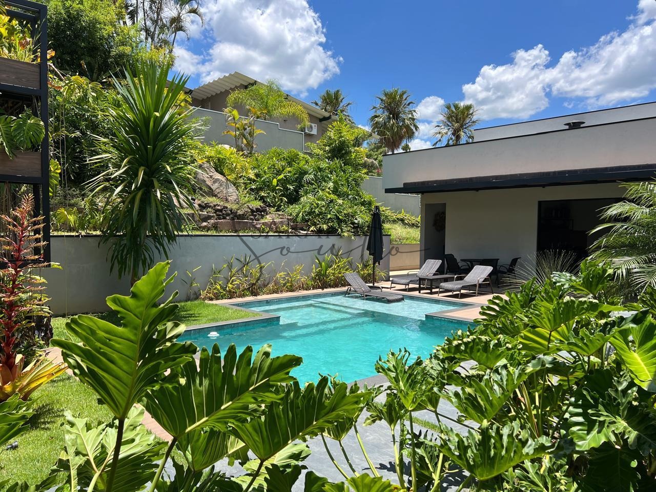 No centro da residência, a piscina se destaca como protagonista, envolta por um paisagismo exuberante, que emoldura toda a casa e cria uma atmosfera elegante, acolhedora e extremamente privativa.