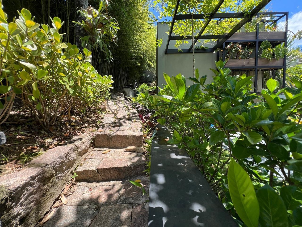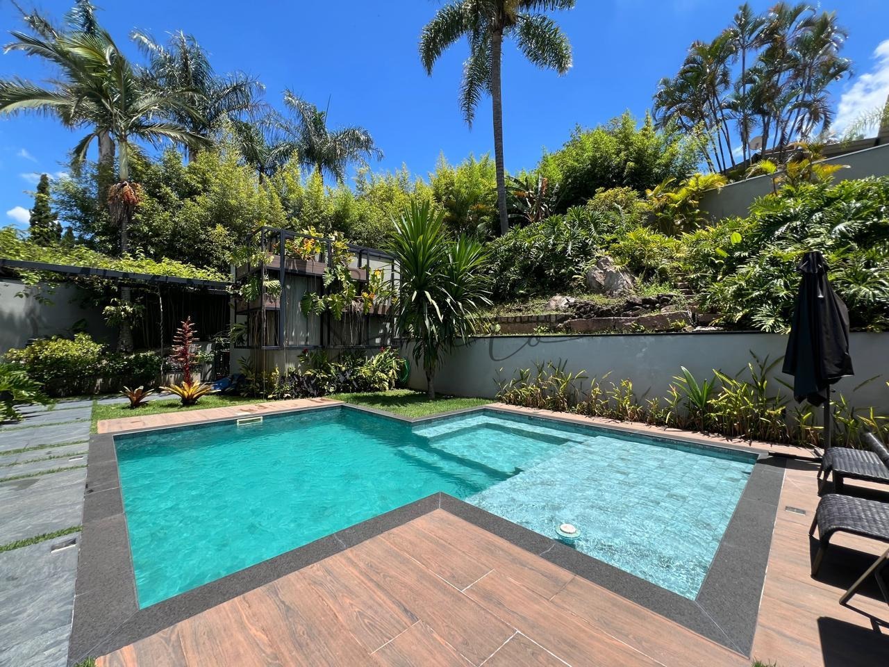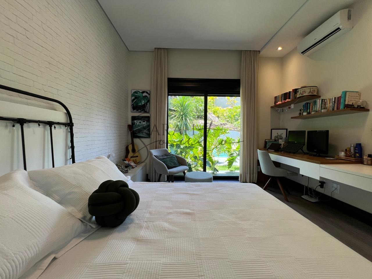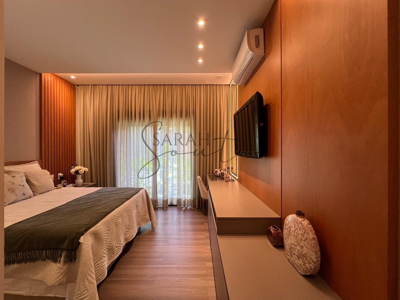 No centro da residência, a piscina se destaca como protagonista, envolta por um paisagismo exuberante, que emoldura toda a casa e cria uma atmosfera elegante, acolhedora e extremamente privativa.